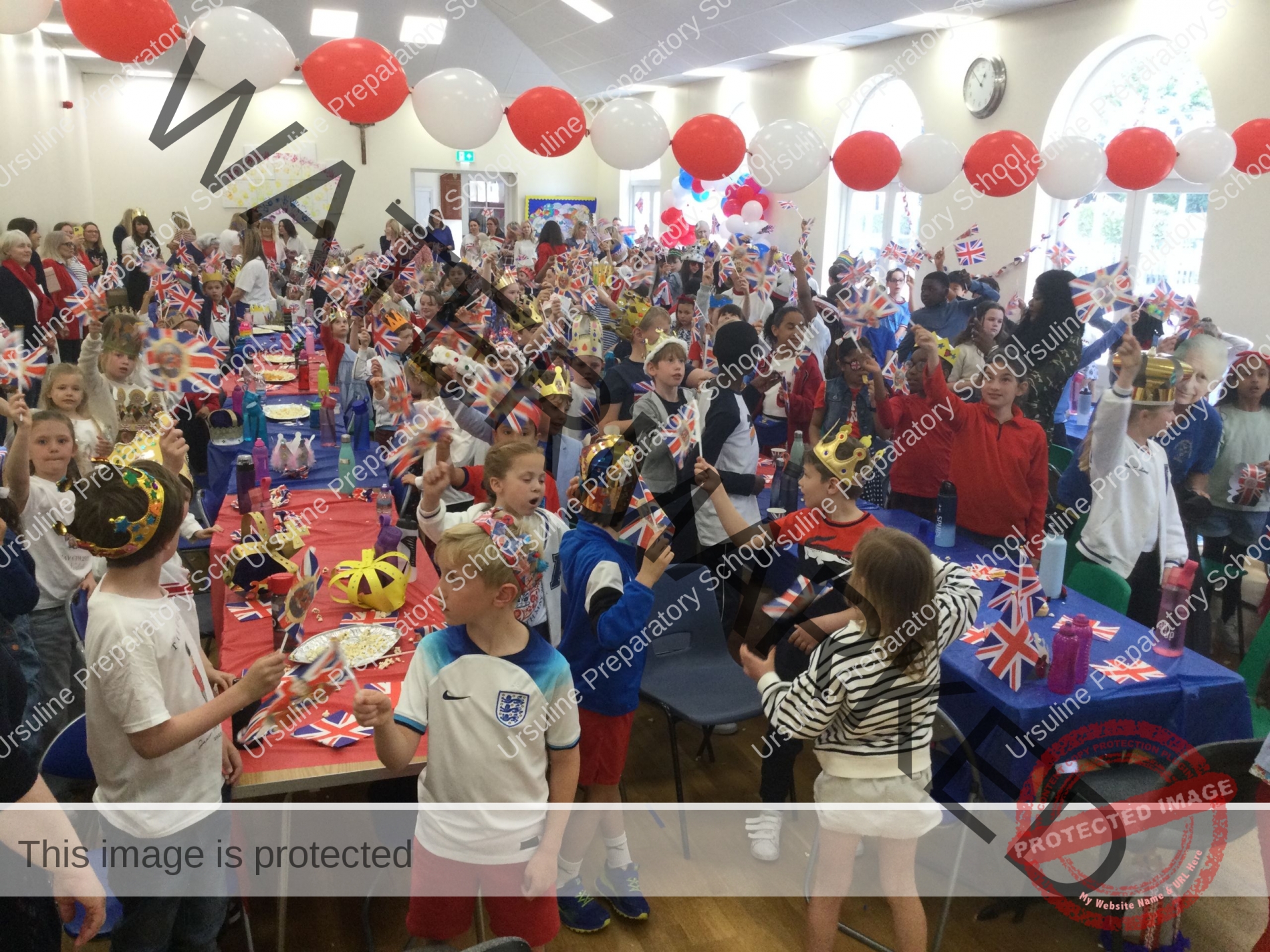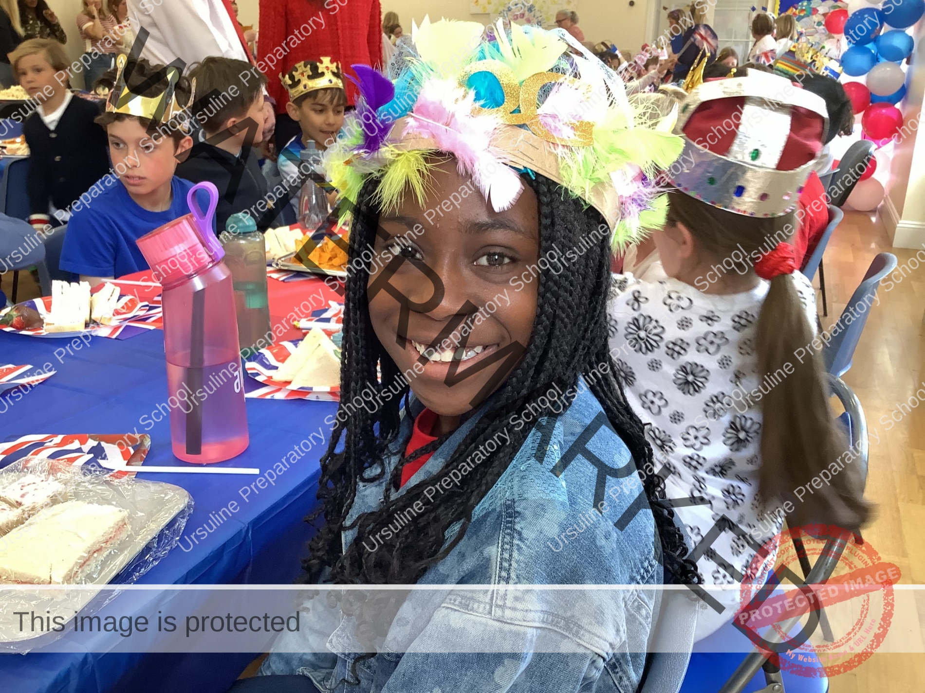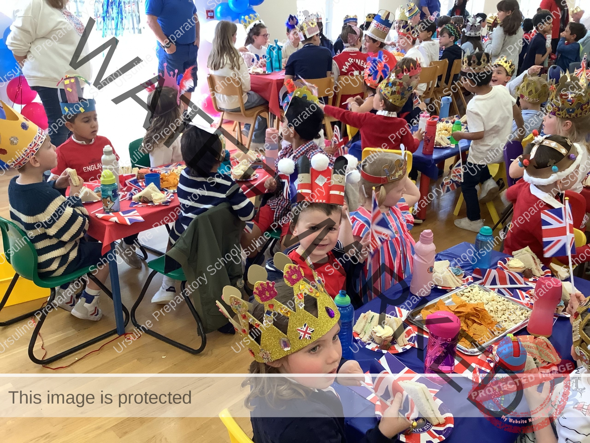 The school was ablaze with flags, bunting and balloons and the hall was transformed into a whole school dining room fit for royalty! All children (and staff) wore red, white and blue and the winners of our crown and picture competition were announced.