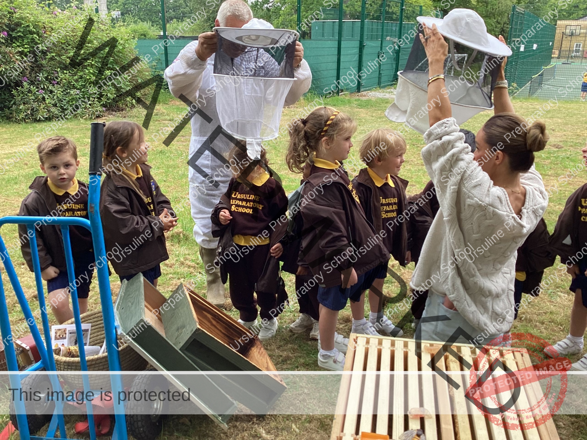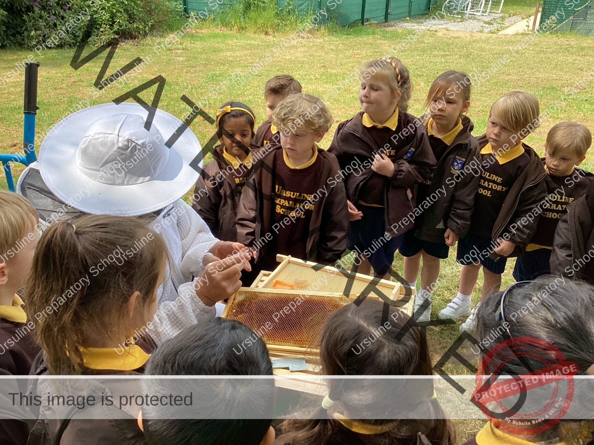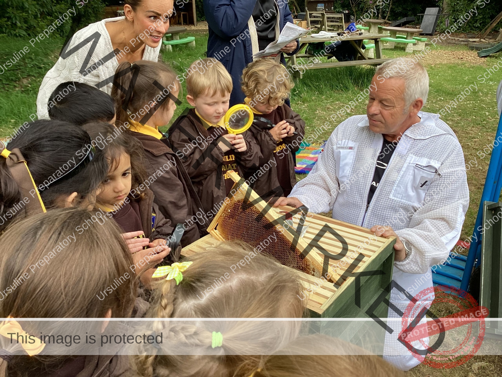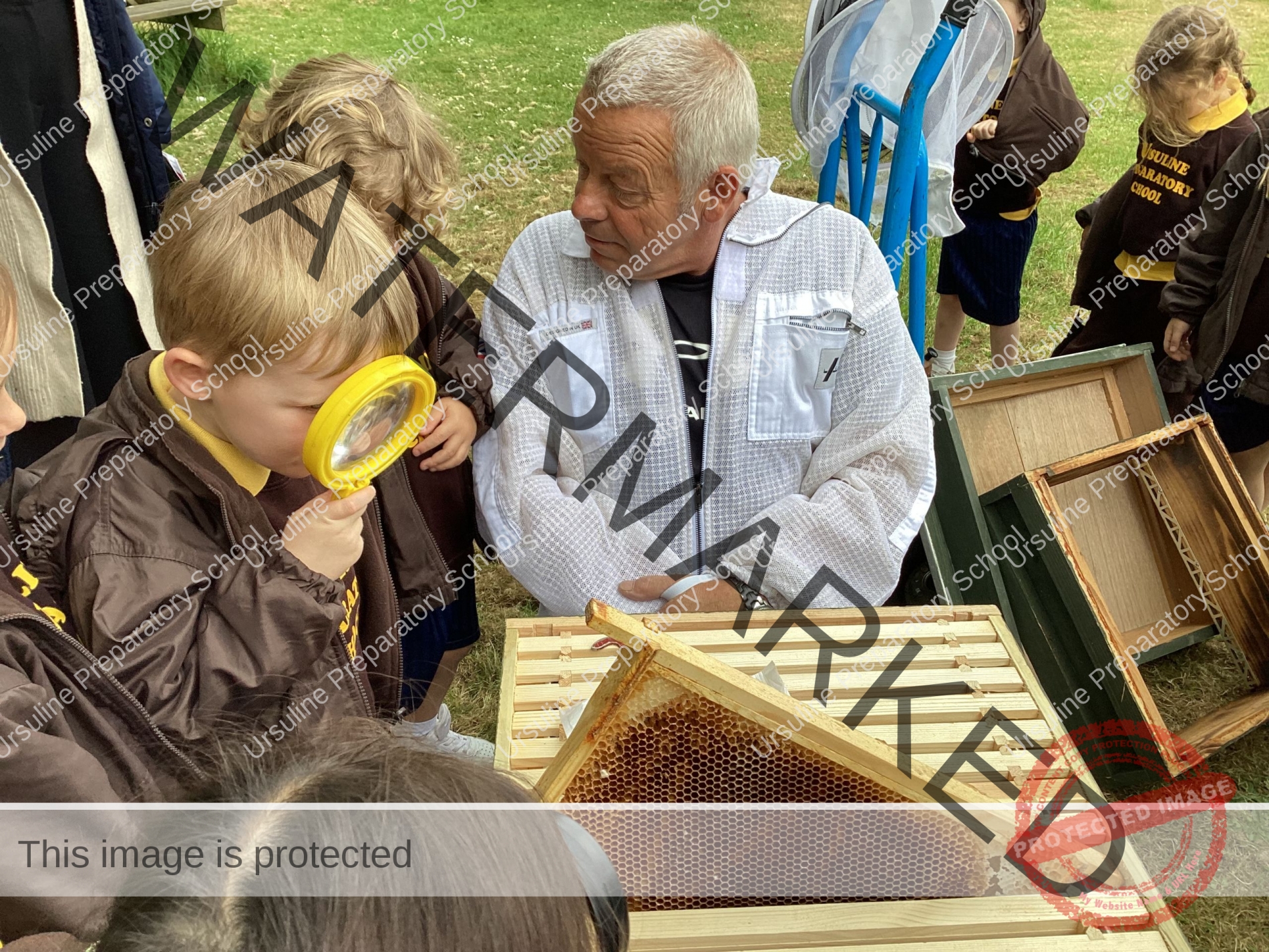 On Wednesday afternoon Reception class had a special visit from a beekeeper, who happened to be the Grandad of one of our children. Bee Keeper Jeff and one of our parents came to see us in the forest area of the school – St. Angela’s Garden – where the children listened intently to a story and then were treated to a very informative talk and demonstration from beekeeper Jeff about the life cycle of a bee, the roles of the various bees, the parts of a hive and then finally tried on a beekeeper’s hat. Some super questions were raised by the children and lots of new vocabulary was learnt, to support our topic work in minibeasts. Afterwards the children ate some honey which the bees had produced in beekeeper Jeff’s hive – delicious!